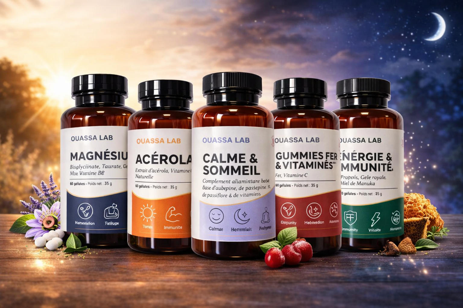 OuassaLab développe des compléments alimentaires adaptés aux besoins essentiels de l’organisme : énergie, équilibre, vitalité et bien-être général.